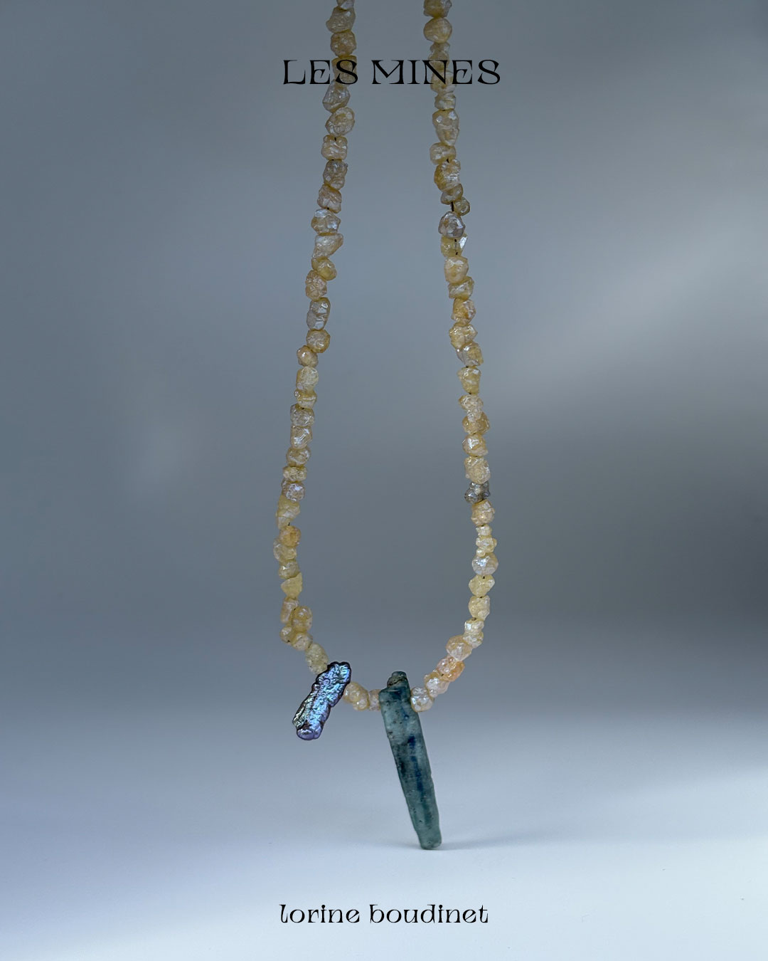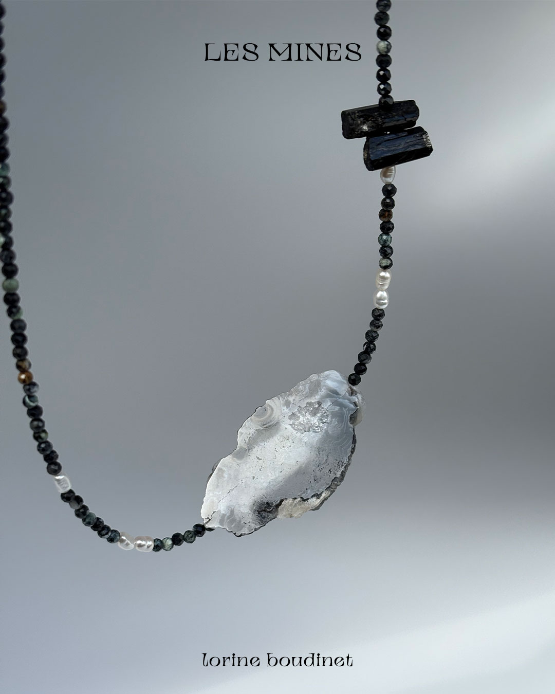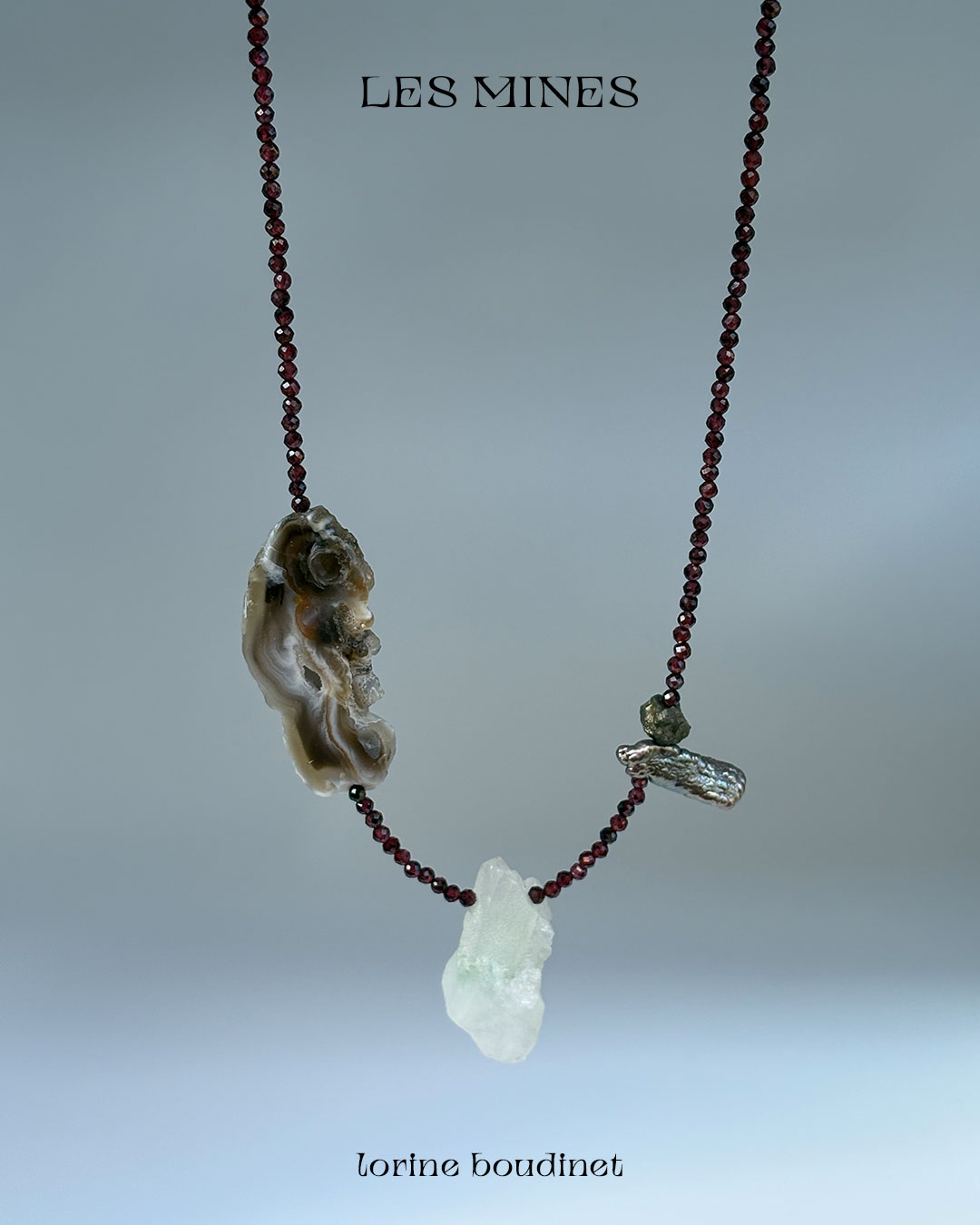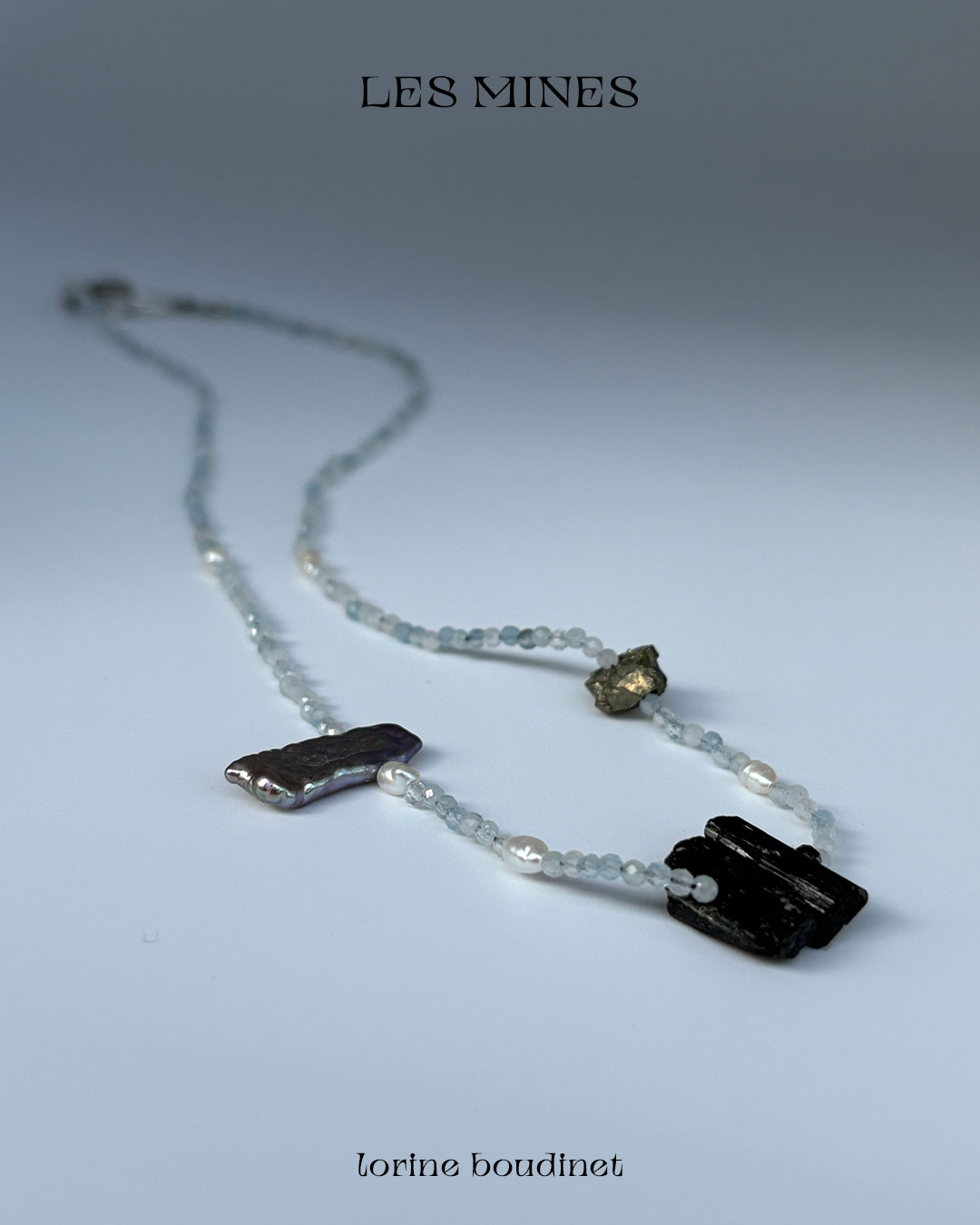 Aquamarine, agate, rock crystal, garnet, kyanite, quartz, pyrite, tourmaline, turquoise and baroque freshwater pearls. The Mines collection celebrates nature’s artistry, the presence of chance, and the subtle mystery of eloquent omens.