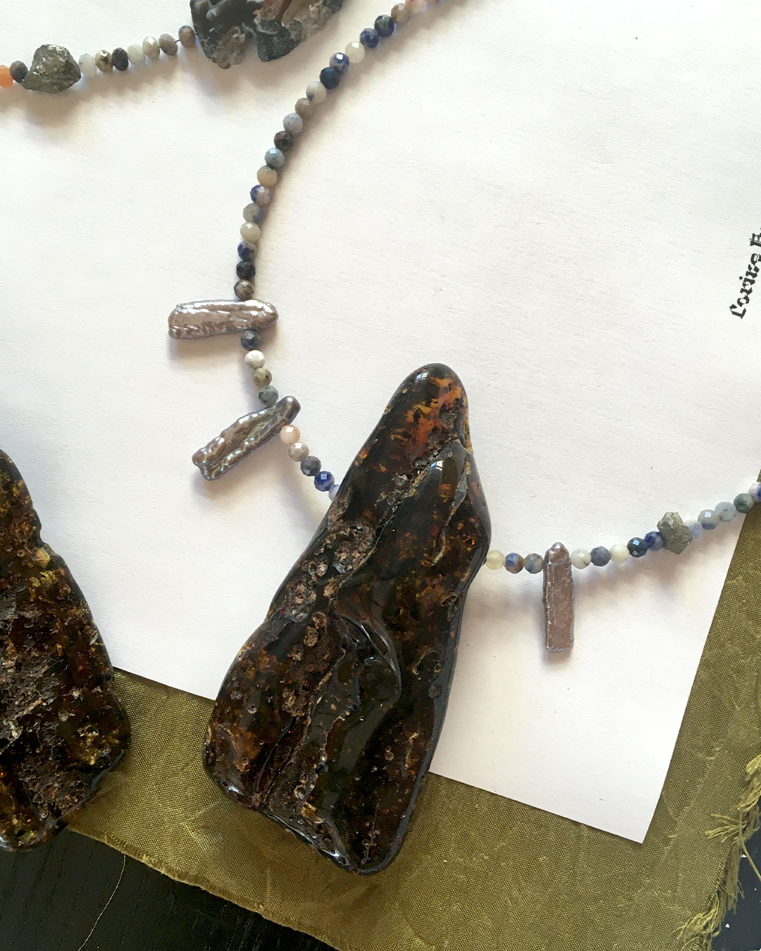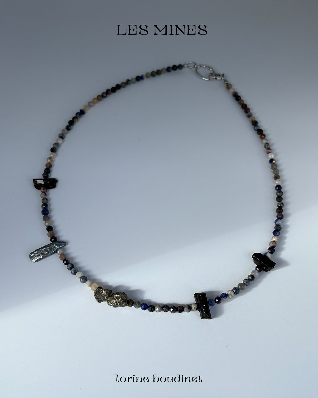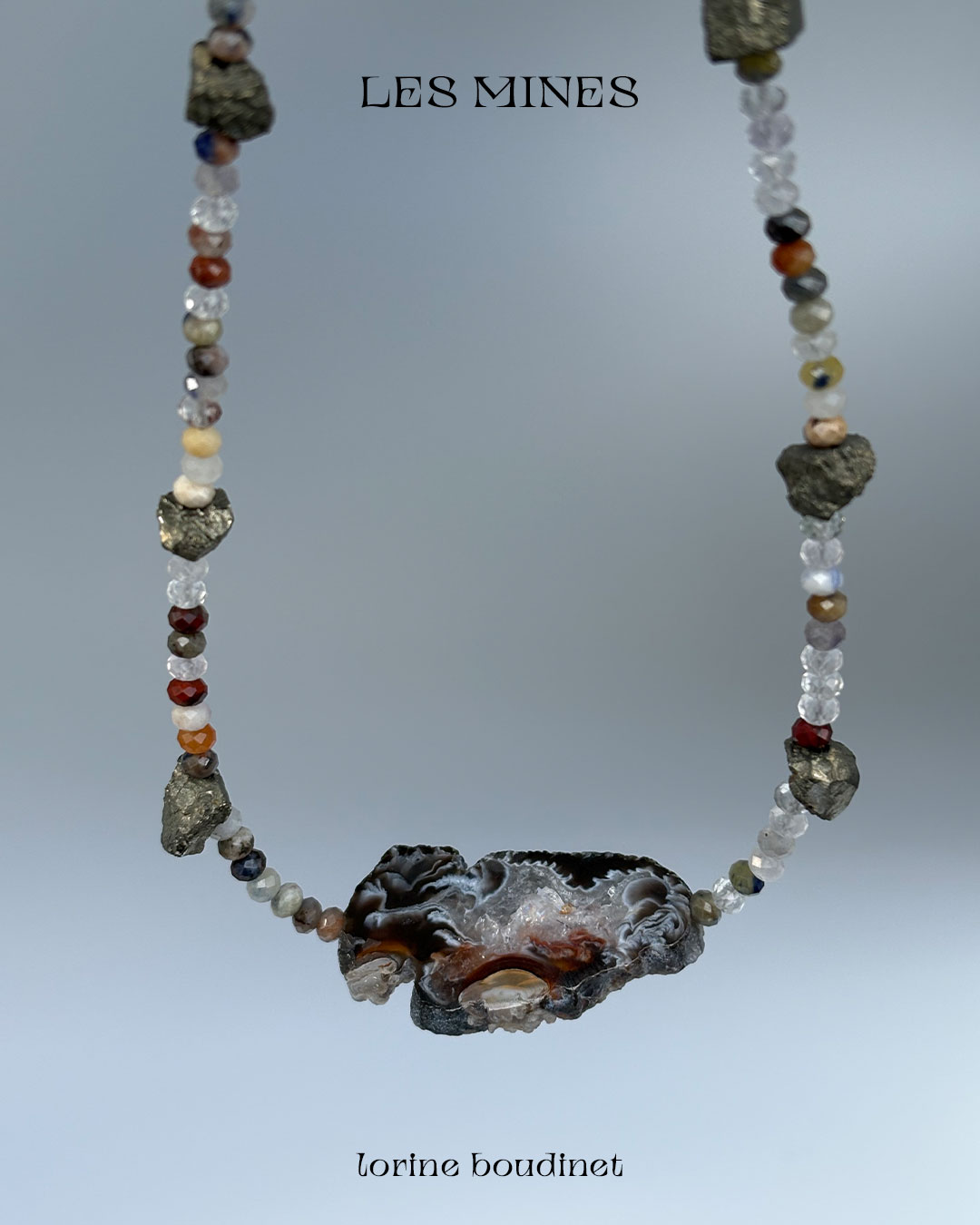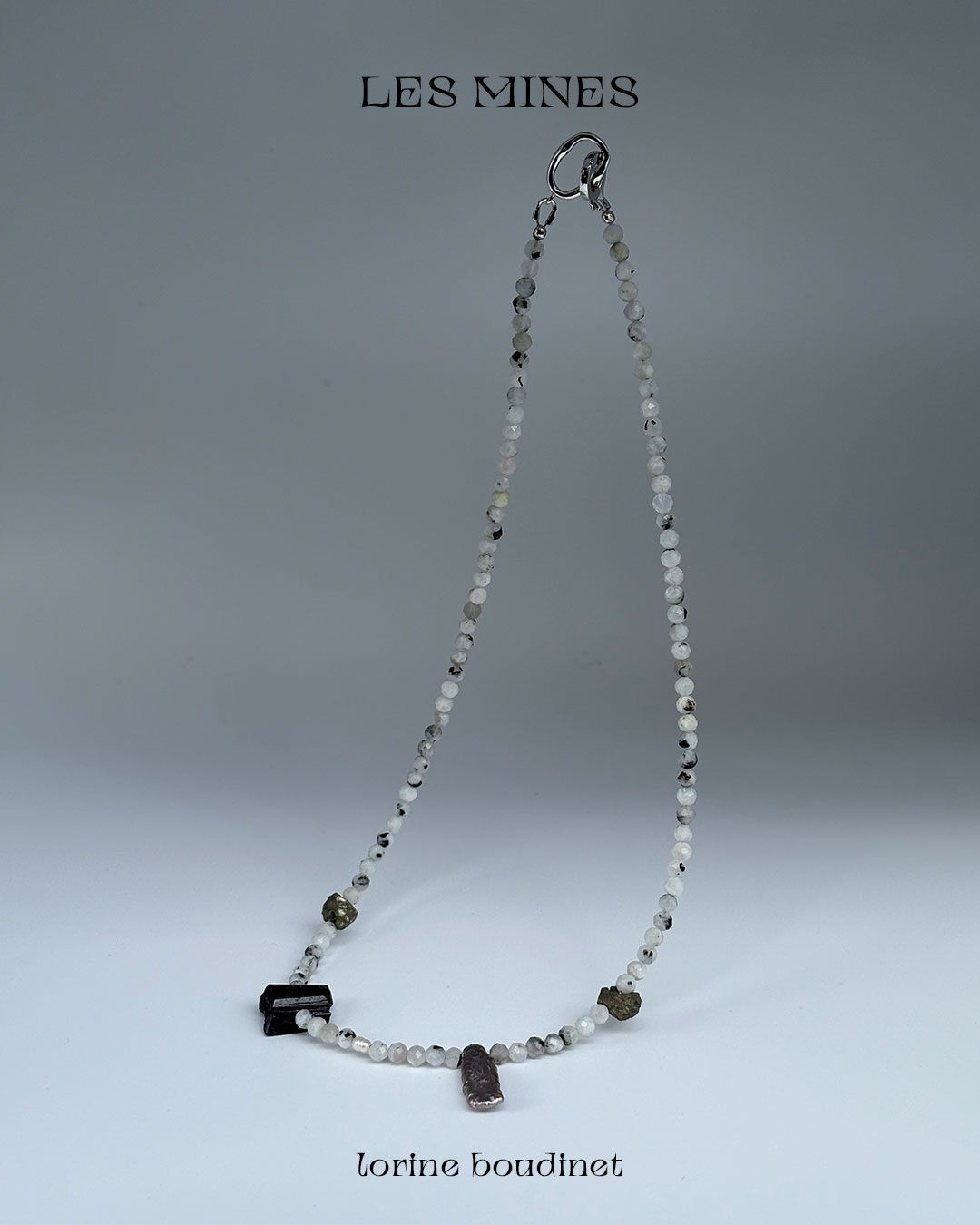 Materials : aquamarine, agate, rock crystal, garnet, kyanite, quartz, pyrite, tourmaline, turquoise, amber and baroque freshwater pearls + silver jewelry clasp.