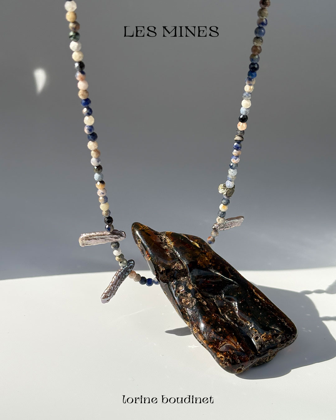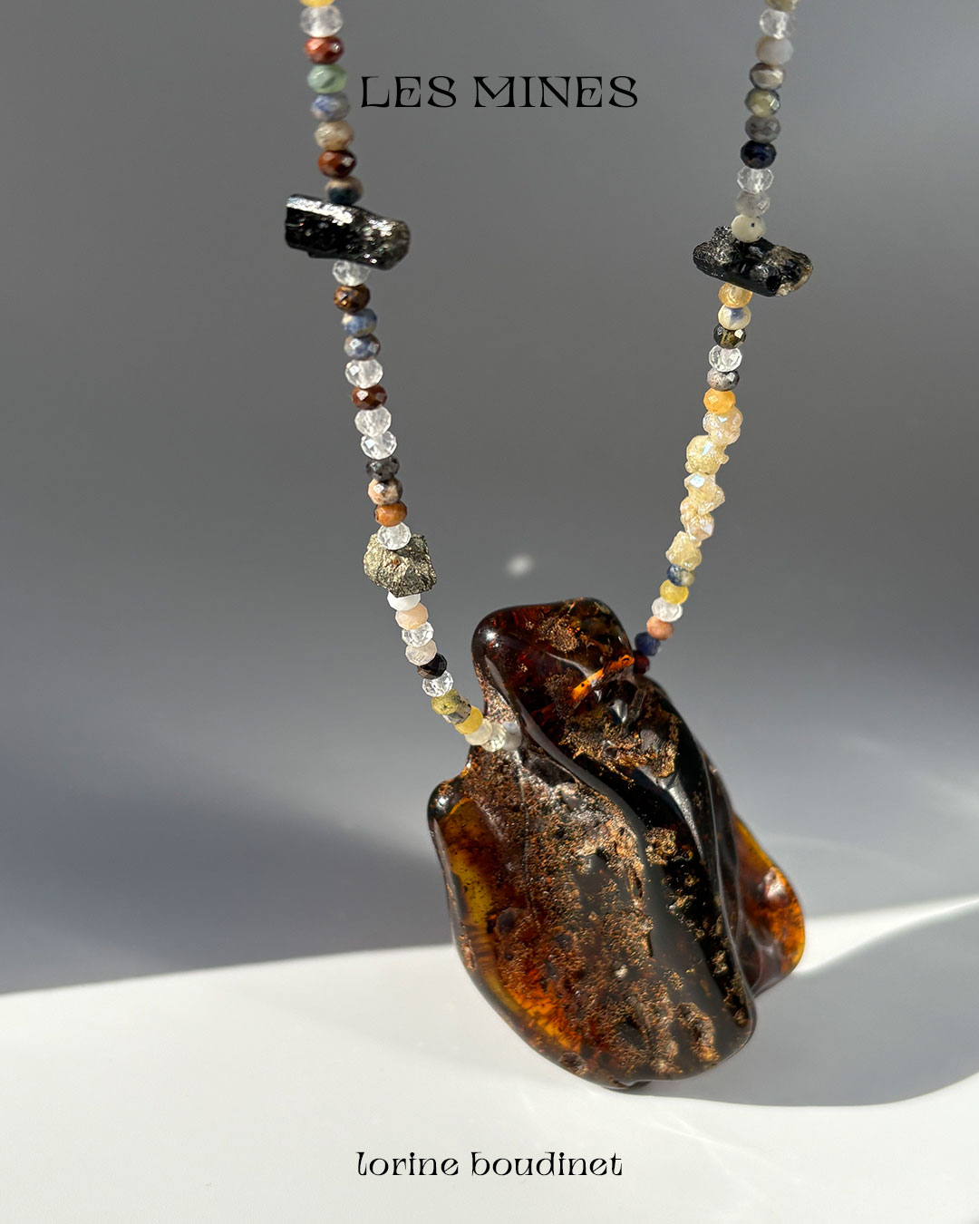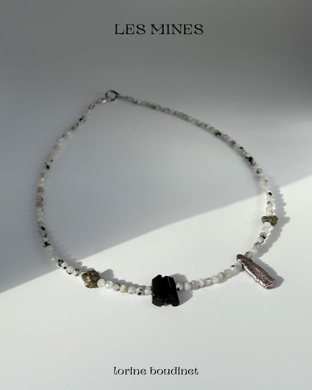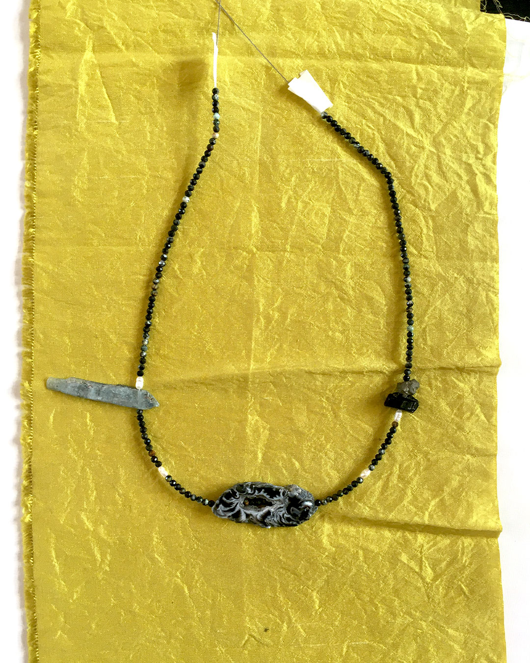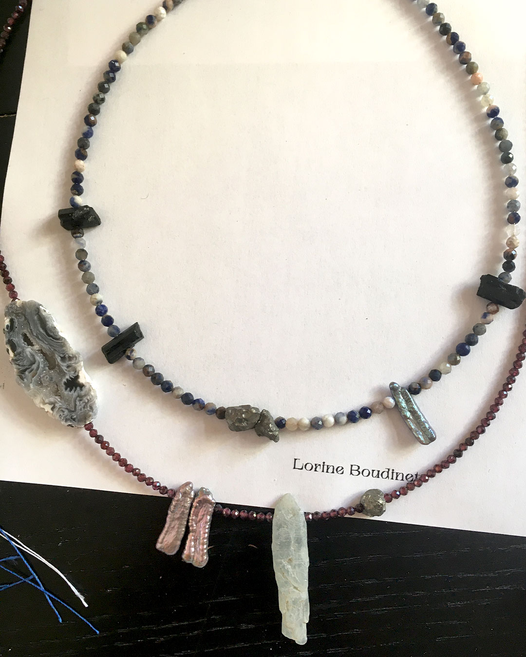 Materials : aquamarine, agate, rock crystal, garnet, kyanite, quartz, pyrite, tourmaline, turquoise, amber and baroque freshwater pearls + silver jewelry clasp.